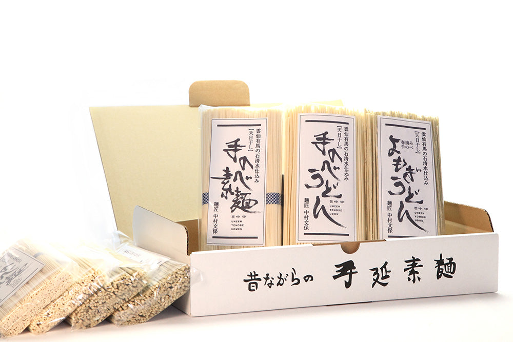 麺通様御用達。厳選した北海道産小麦粉・モンゴルの塩・雲仙岳の石清水だけを原料に、風味豊かな味を引き出しています。職人技と熟成によるコシの強さとうまみが特徴です。 よもぎうどんは中村が元祖の商品です。4月初旬頃までのよもぎの若葉だけを摘んで湯通し、アク抜きをした後、ペースト状にして小麦粉に練りみました。婦人誌ミセスの2007年3月号「かくれた味、うまい味」に掲載されました。 A favorite of noodle connoisseurs. Made from carefully selected...